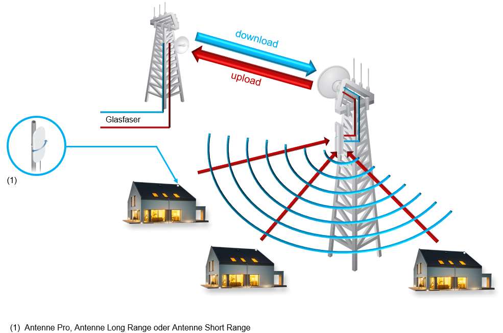 Wir realisieren unsere Breitband Zugänge über Richtfunk Antennen, die auf dem neuesten Stand der Technik basieren. Dadurch stehen uns hohe Bandbreiten zur Verfügung um auch für die datenintensive Zukunft gerüstet zu sein. Unsere Antennen bauen wir an exponierten Standorten auf um unseren Kunden jederzeit einen guten Empfang gewährleisten zu können. Die einzelnen Antennenstationen werden wiederum mit Highspeed Richtfunkverbindungen an unser Glasfaser-Breitbandnetz angeschlossen. Damit können wir Bandbreiten von derzeit bis zu 150 MBit anbieten. Auf Kundenseite muss lediglich eine kleine Antenne am Haus montiert werden die auf einen unserer Antennenstandorte ausgerichtet ist. An dieser Empfangsantenne wird anschließend ein Netzwerkkabel angeschlossen das dann direkt mit Ihrem W-Lan Router oder Switch verbunden wird. Sie benötigen bei der Antenne übrigens keine Steckdose. Wir haben einen Router für Sie, welcher die Antenne direkt mit Strom versorgt, siehe Bild.5